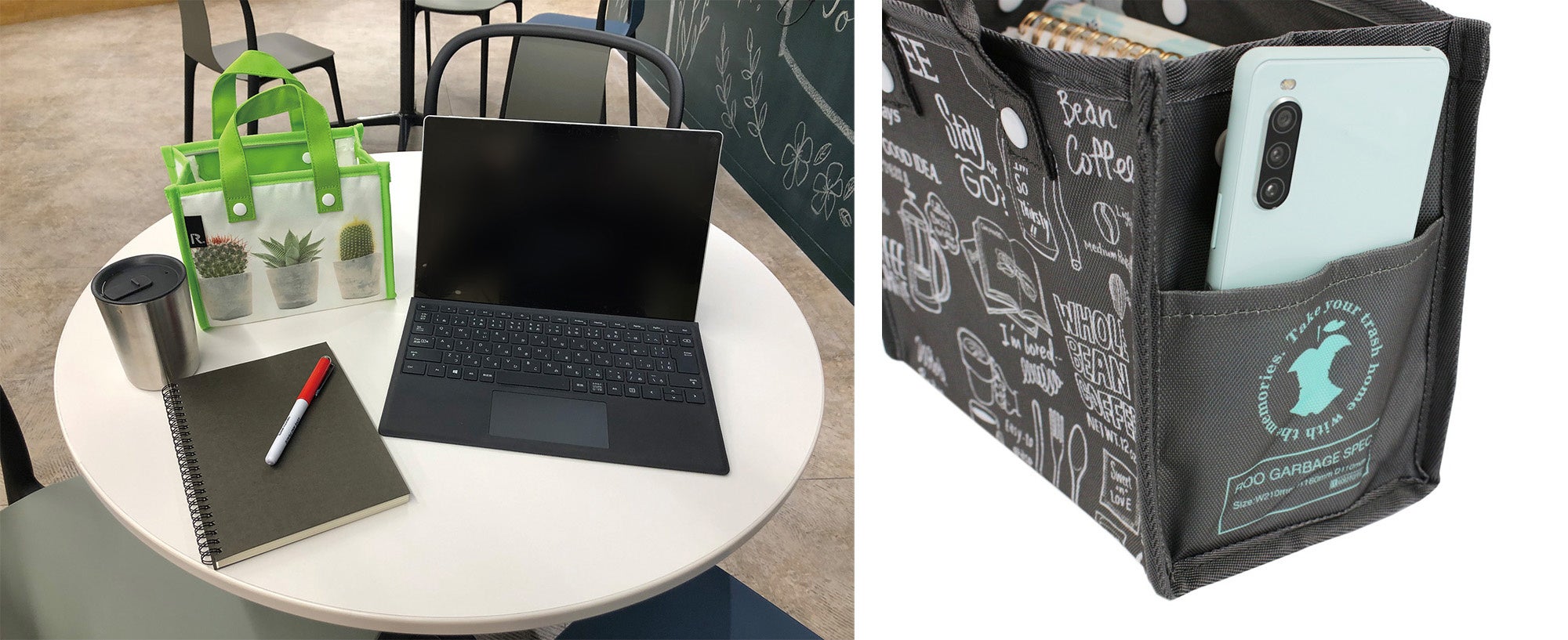 コワーキングスペースや自宅のテレワークスペースなどで活躍する「ルー・ガービッジ Desktop」。内側にコンビニ袋サイズのポリ袋を取り付けて使えます。自立性があり持ち運びしやすく、使用しないときはコンパクトに収納できます。楽しいデザインをのせた、再生ポリエステル素材。観葉植物の鉢カバーや卓上小物入れとしてもお使いいただけます。