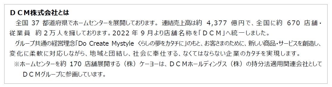 全国でホームセンター事業を展開するDCM 株式会社 (本社:東京都品川区、代表取締役社長:石黒靖規)は、連結子会社であるDCMニコット株式会社(本社:北海道札幌市、代表取締役社長:上田常世)が運営するホームコンビニ ® 「DCMニコット 綾里店」岩手県大船渡市を、9月22日(木)に新規オープン します。DCMニコット綾里店は、岩手県内で7店目、全店で 112 店目の出店です。