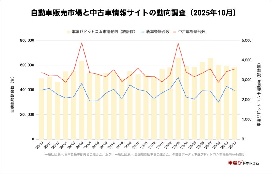 株式会社ファブリカホールディングスの完全子会社、株式会社ファブリカコミュニケーションズ(本社所在地:愛知県名古屋市中区、代表取締役社⻑CEO:⾕⼝ 政⼈)が運営する中古⾞情報サイト「⾞選びドットコム」は、2025年10月の新車・中古車登録台数の推移および当サイトの販売台数推移をもとに中古車市場の動きをまとめた『中古車市場統計レポート』をご案内いたします。