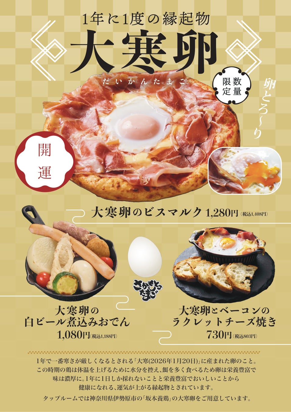元祖地ビール屋サンクトガーレンの樽生ビール20種が楽しめる直営ビアバー「サンクトガーレン タップルーム(本厚木駅ビル 本厚木ミロード2. 1階/オーナー 岩本伸久)」は2026年1月22日(木)より、縁起物“大寒卵”を使ったピザやおでんを販売します。
