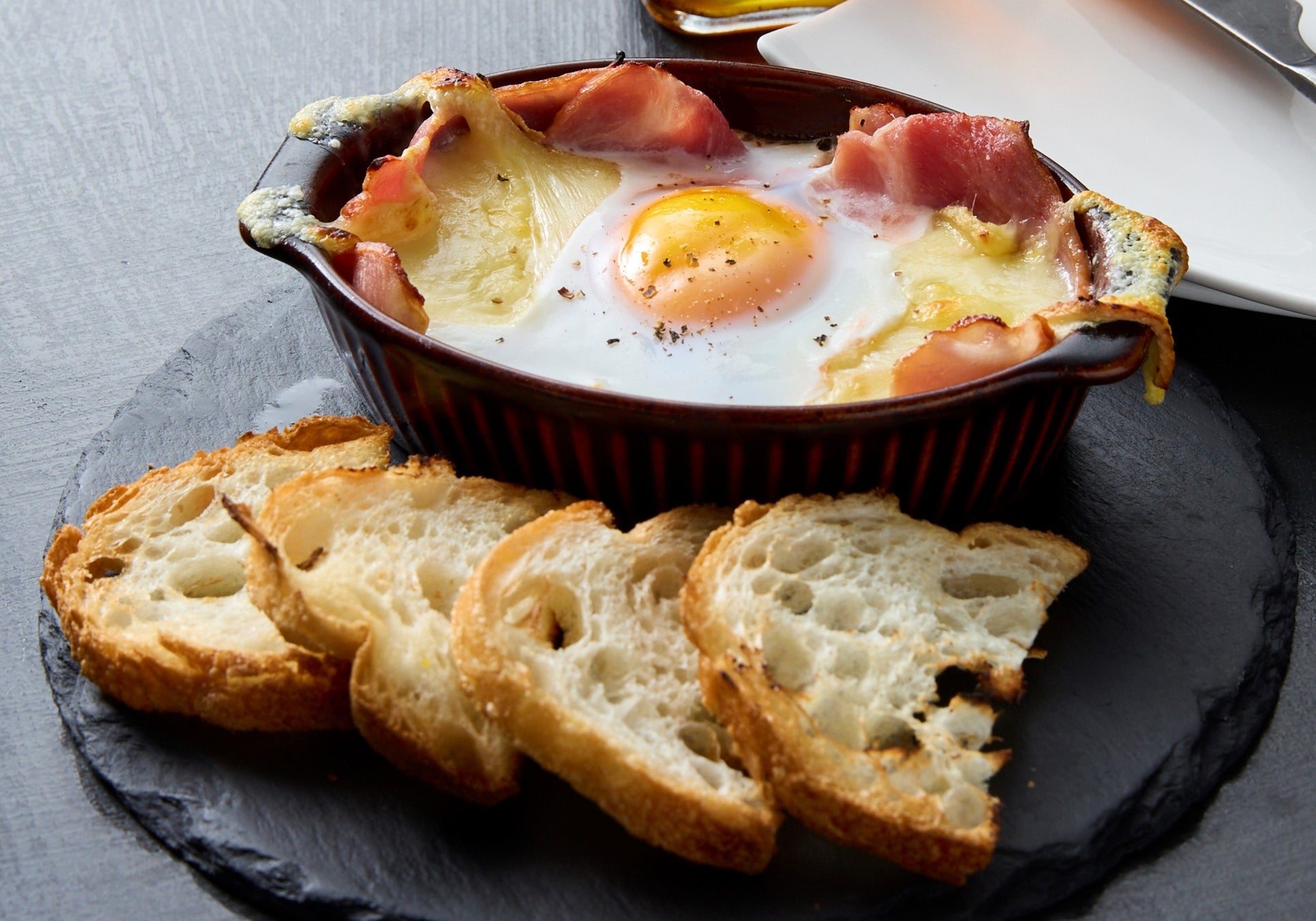 濃厚ラクレットチーズとベーコン、トマトソースと卵を石窯で焼き上げました。
