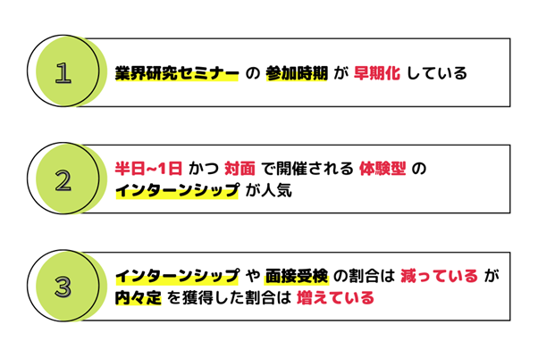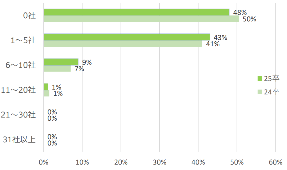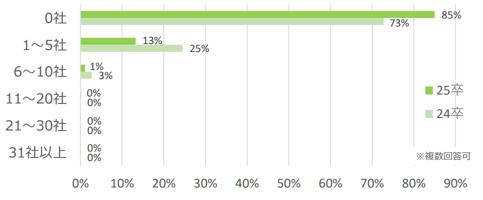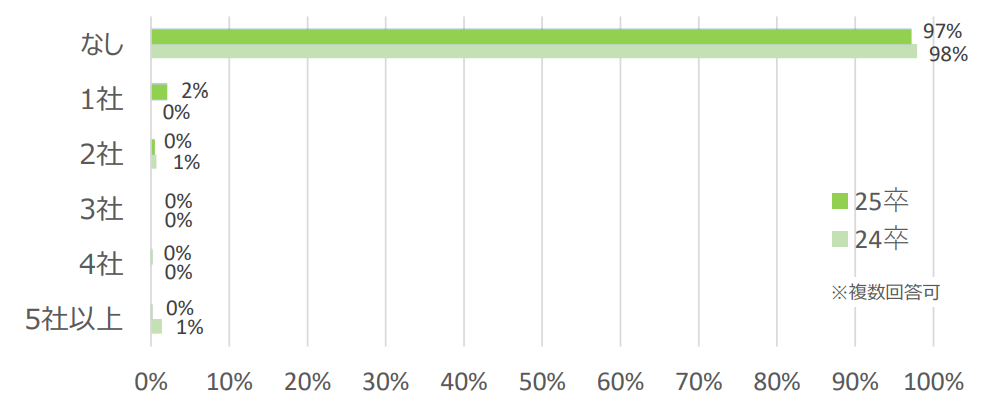 インターンシップに参加した割合や面接を受検した割合は、24卒より低下している。しかし、内々定を獲得している割合は3%、24卒は2%であったため微増ではあるが増加している。早期のため割合は少ないが、他のステップで減少しているのに対して増加しているため注目すべき点だといえる。面接を受ける企業を絞って高確率で内々定を獲得している傾向がみられる。