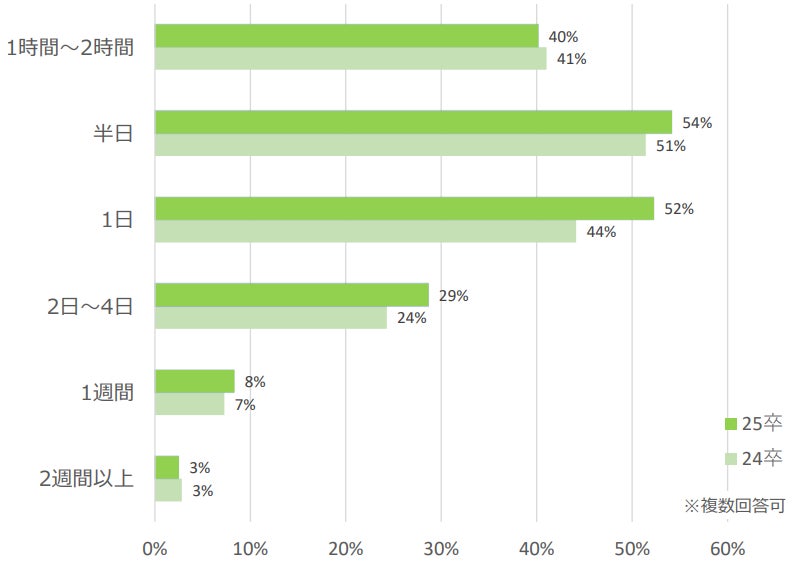 参加したいインターンシップについて調査したところ、参加時間として最も多かったのは【半日】次いで【1日】となった。参加形態としては【対面】を希望する学生が多く、【オンライン】希望を30%以上上回った。インターンシップの内容としては、24卒と同じく【体験型】の内容が人気で、上位を占めた。