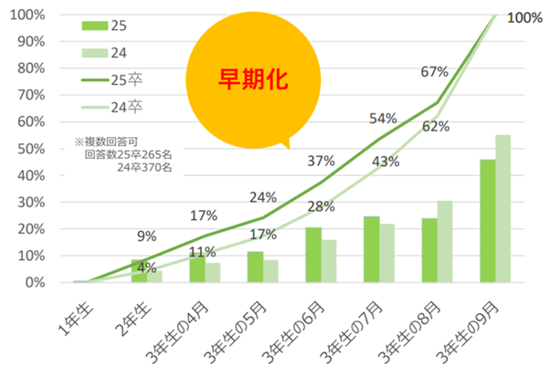 業界研究セミナーの参加時期別の参加率を見てみると、3年生の4月〜7月において全ての月で24卒の参加率を上回っている。このことから、業界研究セミナーに参加する時期が早期化していることがわかった。