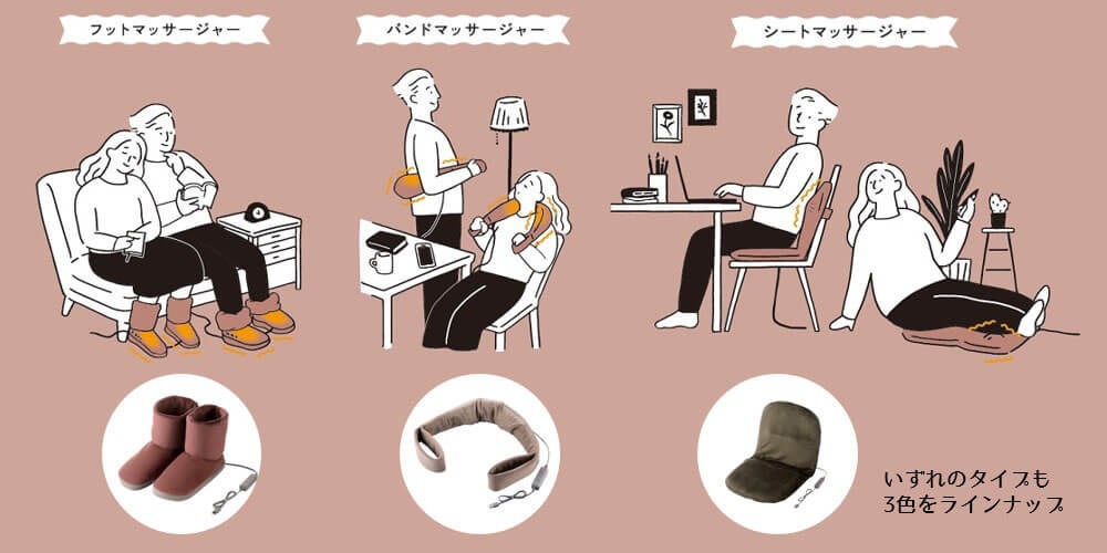 ケアしたい部位によって選べる3タイプの振動マッサージ×あったかマッサージャーです。