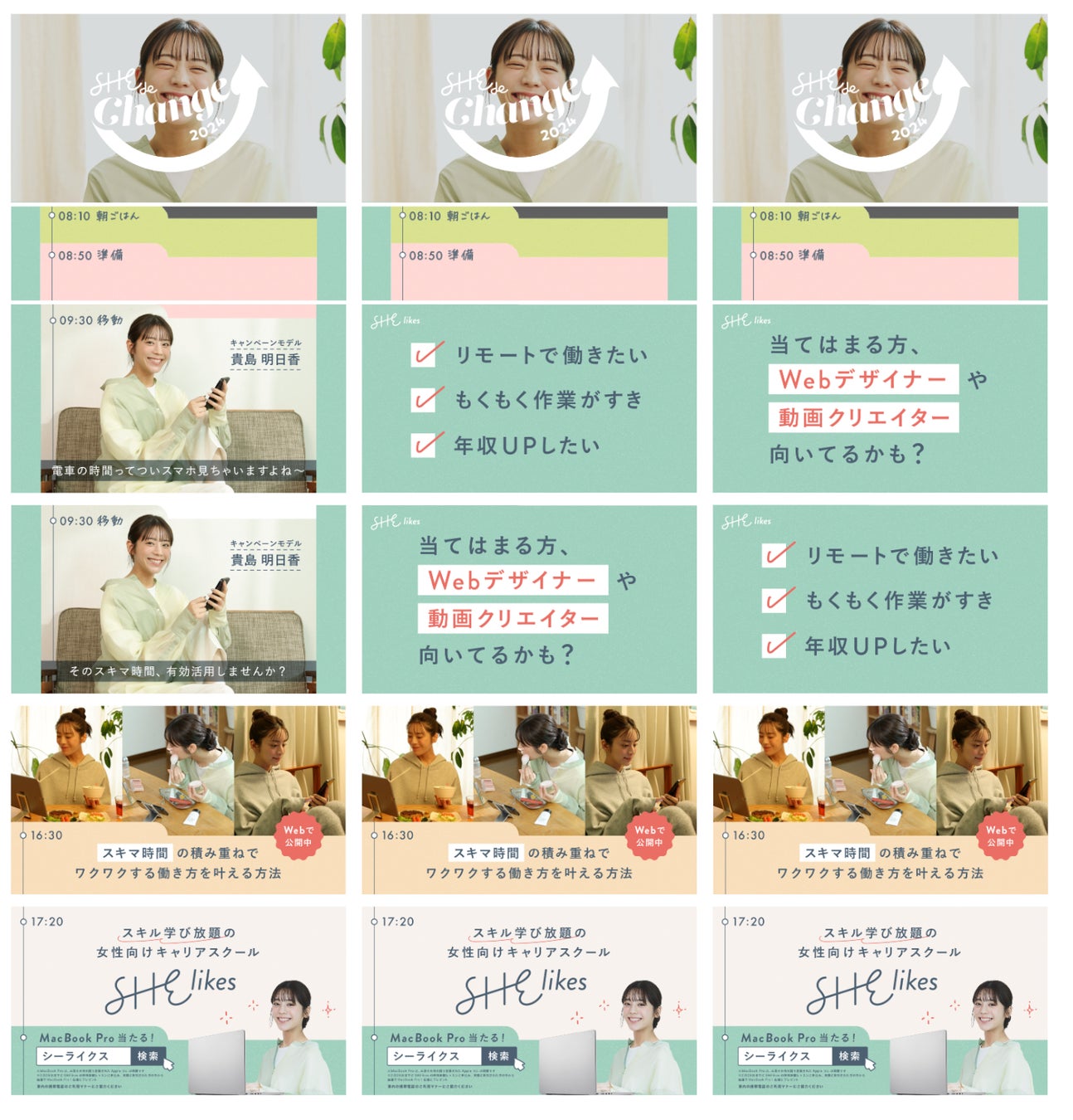 学ぶから働くまでをサポートする女性向けキャリアスクール「SHElikes(シーライクス)」を運営するSHE株式会社(所在地:東京都港区、代表取締役CEO/CCO:福田恵里、以下SHE)は、貴島明日香さんをイメージモデルに起用した春のキャンペーンを、2024年4月1日(月)から5月31日(金)の期間で実施しています。この度、貴島明日香さんがスキマ時間を活用してパソコンやスマートフォンを使って学習に励む様子を描いたキャンペーン動画を、山手線ほかJR東日本の車内サイネージにて、5月6日(月)〜12日(日)の期間限定で公開いたします。キャンペーン詳細はこちら:https://cutt.ly/deqLOjLy