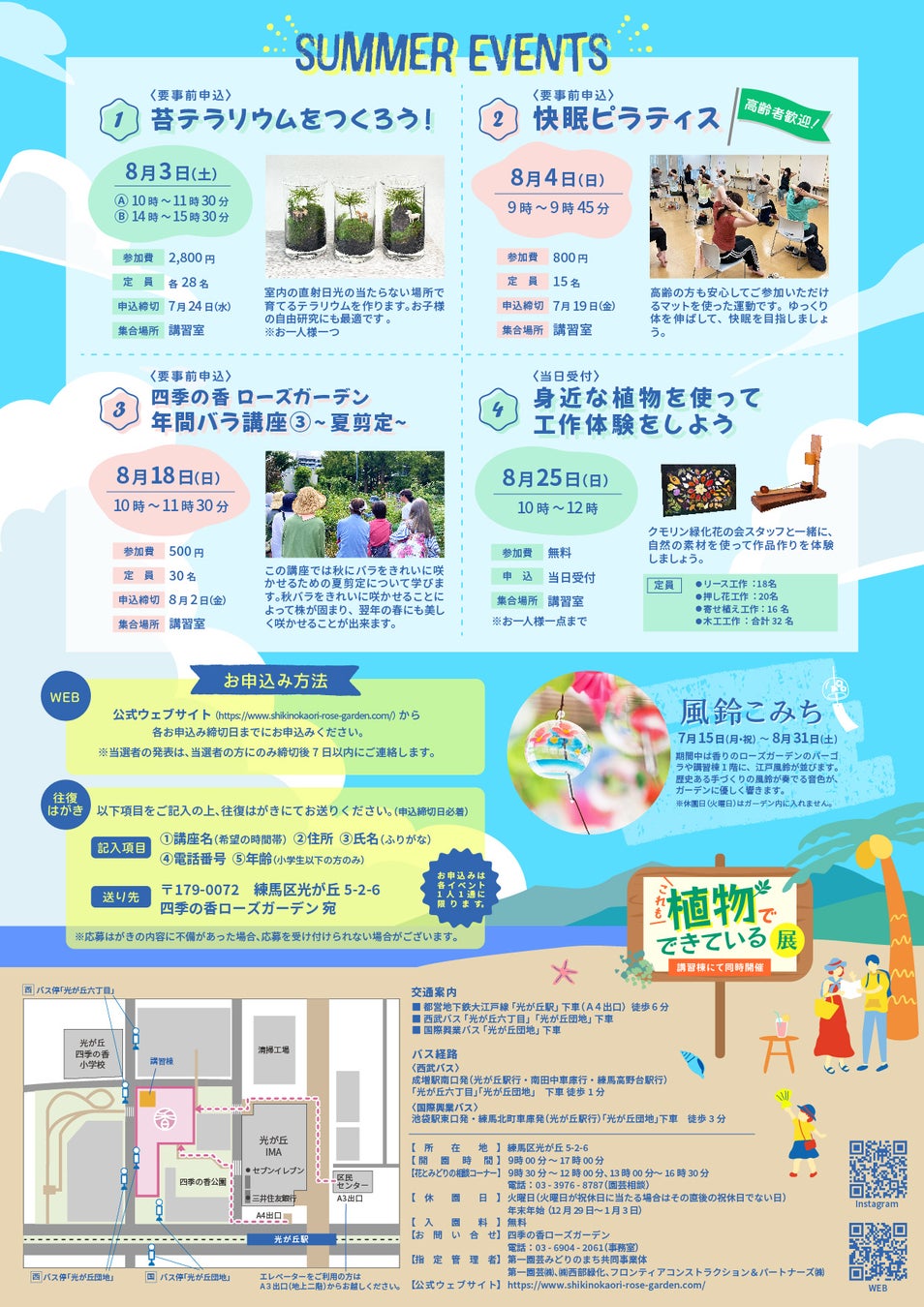 7月15日(月・祝)からは、昨年初開催し大好評だった「風鈴こみち」が四季の香ローズガーデンに今年も登場します。8月には大人の趣味としても、自由研究でも楽しめる第一園芸のフローリスト中川桃が講師の苔テラリウム作りワークショップや、「バラ図鑑475種」の著者でもある入谷伸一郎先生による年間バラ講座なども開催します。大江戸線光が丘駅にも近く入園無料ですので、各イベントはじめ夏の元気な花々の鑑賞など、ぜひご来園ください。
