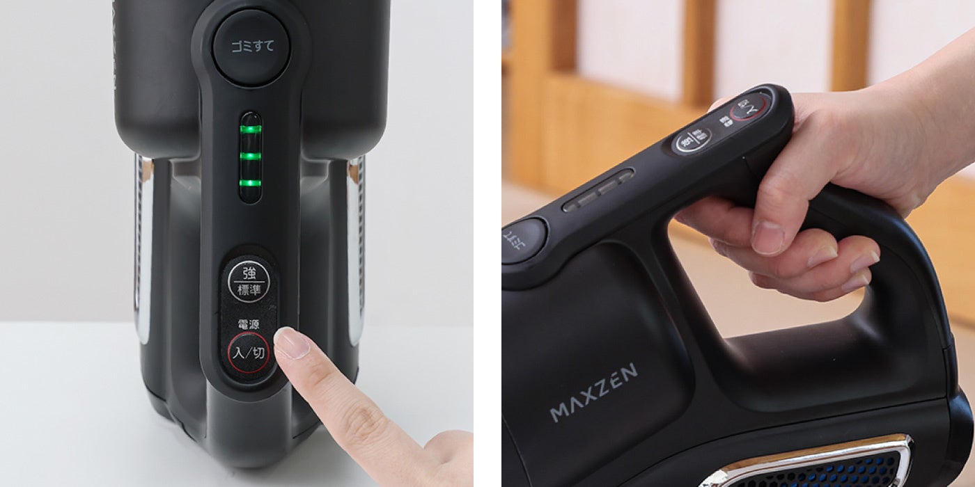 電源ボタンを押すと「標準」モードで運転を開始します。また、吸引力を切り替える場合は、「強/標準」ボタンを押すだけのシンプルな設計です。また、グリップ部分にはスイッチが無い為、押しっぱなしや誤作動によるストレスが少なく、快適にご使用いただけます。
