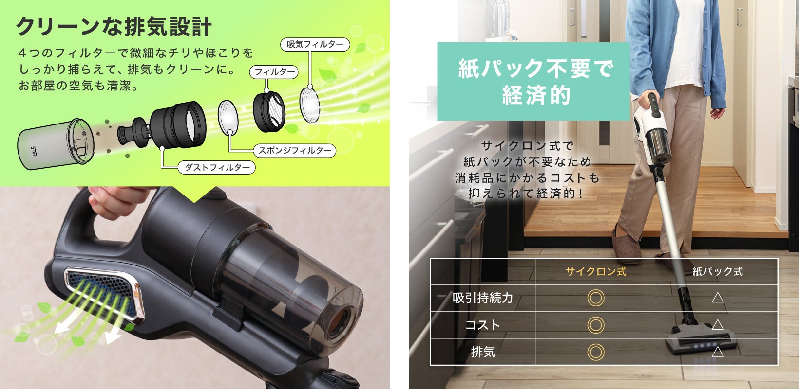 本製品が採用しているサイクロン式は、紙パックを使用しない為、交換用紙パックを購入する手間とコストがかからず経済的です。また、紙パックにゴミがつまることによる吸引力の低下も発生いたしません。細かいチリやホコリを見逃さずパワフルに吸引、遠心力で空気とゴミを分離し、その後空気のみをフィルターを通して排気し、排気の汚れやにおいを軽減いたします。