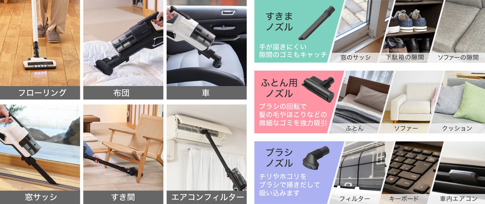 ■コードレス&3種類のノズルで家中どこでも掃除可能!