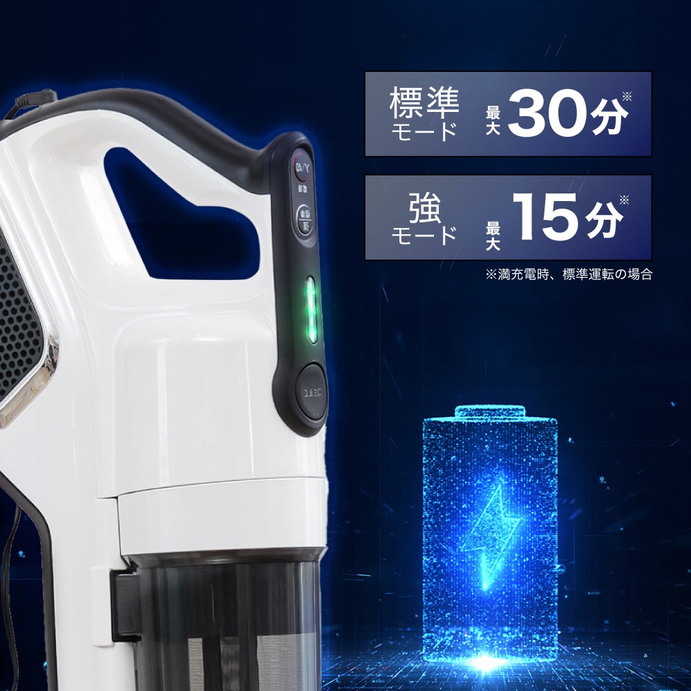 充電4時間で、標準モードでは最大30分、強モードでは最大15分の運転を可能とする、2,200mAhの大容量バッテリーを搭載しております。