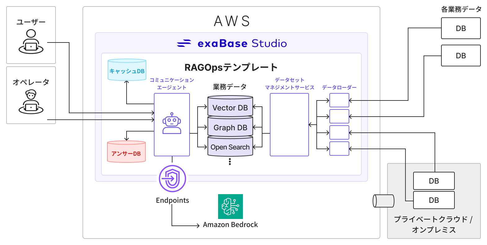 RAGOps は、プラットフォームとなるexaBase StudioとAmazon Bedrock間のデータ通信を閉域にすることでセキュアに利用できます。