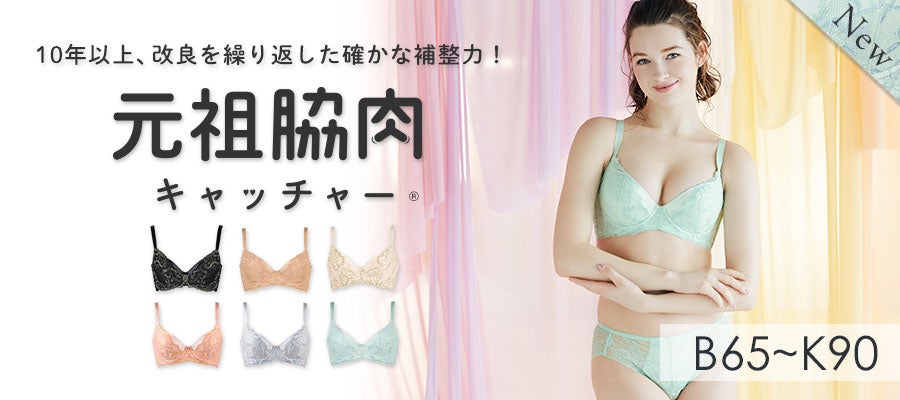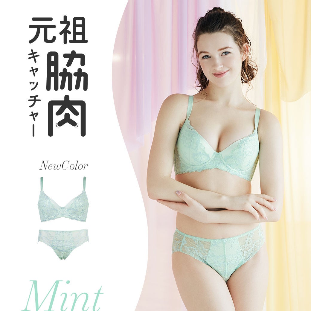 バツグンの補整力で不動の人気No.1。脇高ブラのパイオニア!シリーズ累計80万本突破の大人気ブラ「元祖脇肉キャッチャー 」から春の新色・ミントが登場。