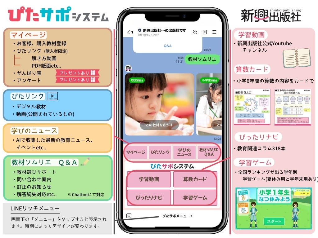 「ぴたサポシステム」は、新興出版社の公式LINEに友達登録するか、ウェブからお客様登録を行っていただくことでご利用いただけます。