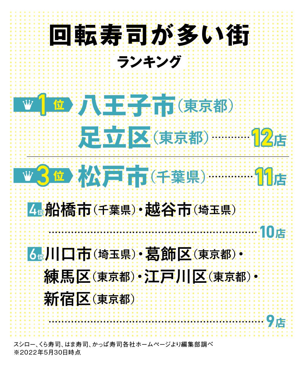 ①「回転寿司が多い街ランキング」では、東京都「八王子市」と「足立区」が1位