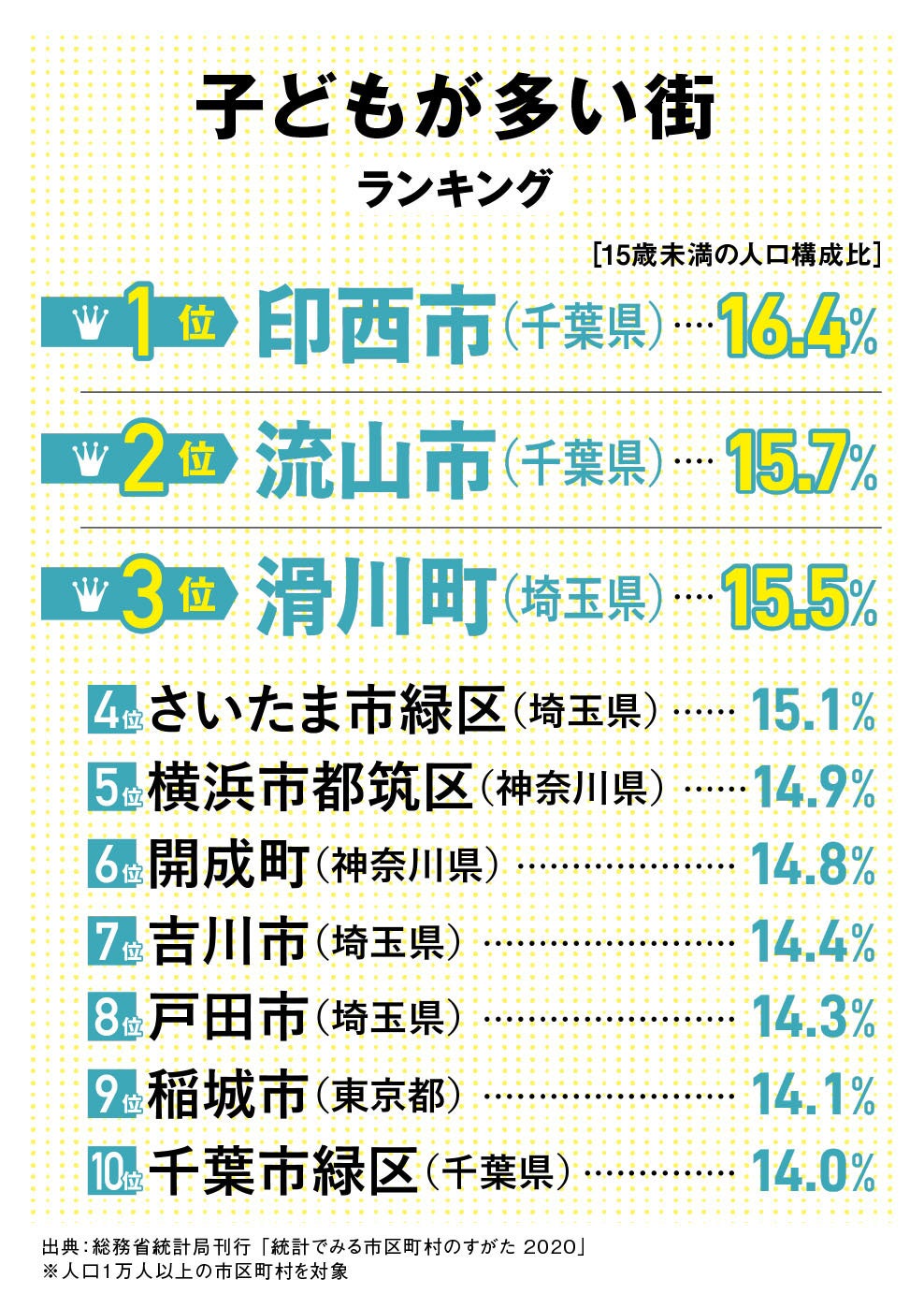 15歳未満の人口構成比が高い「子どもが多い街ランキング」は、千葉県の「印西市」が15歳未満の人口構成比16.4%で1位となりました。2位に千葉県の「流山市」、3位に埼玉県の「滑川町」がランクイン。子育て支援策に力を入れている自治体が上位にランクインする傾向でした。ほかにも、神奈川県の「開成町」や埼玉県の「吉川市」といった、人口10万人以下の比較的小規模な街もランクインしています。