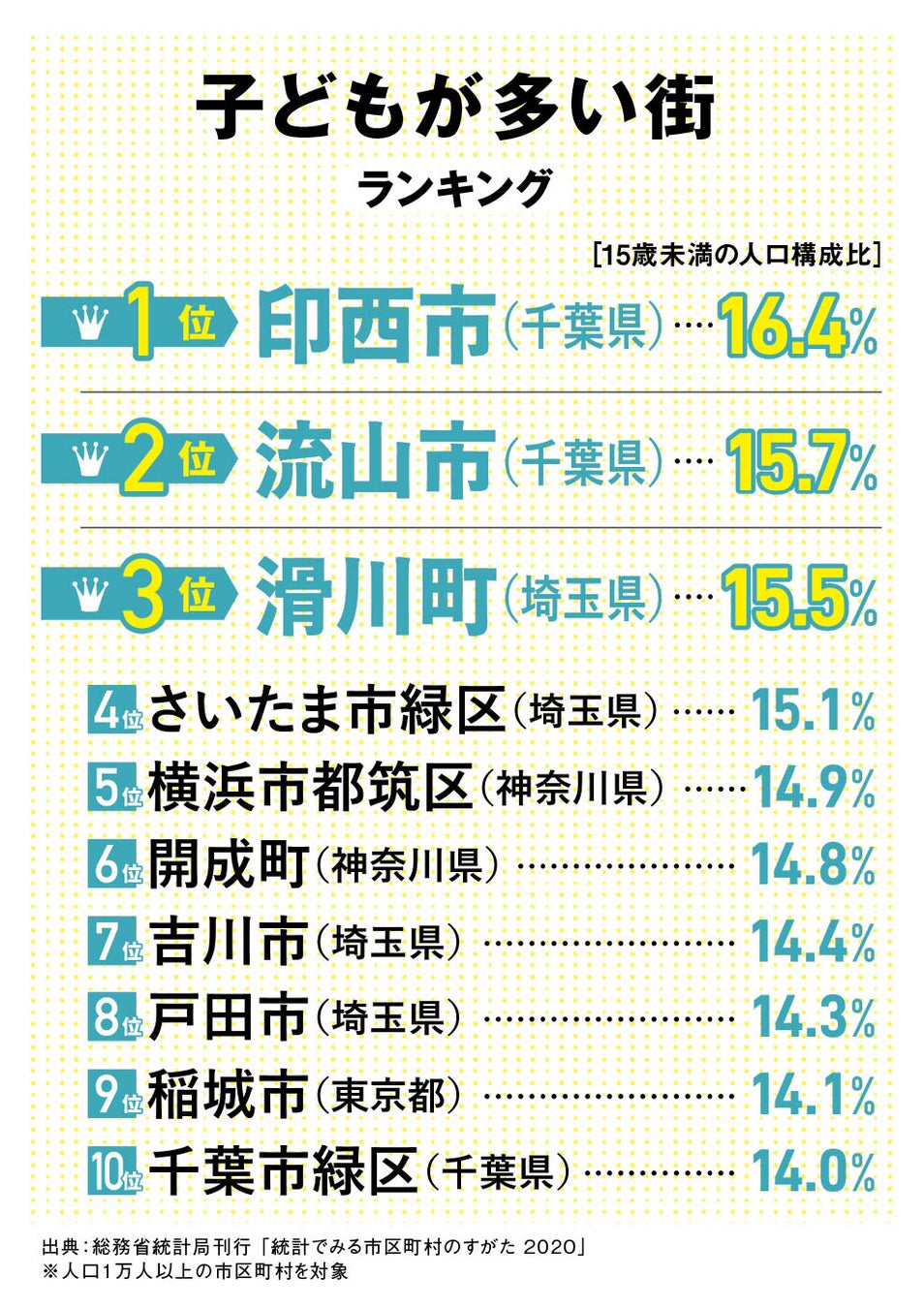 ③「子どもが多い街ランキング」は千葉県の「印西市」が1位。自治体の子育て支援策の充実度が影響か。