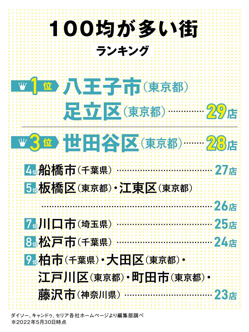 ②「100均が多い街ランキング」でも、東京都の「八王子市」と「足立区」が同率1位に。