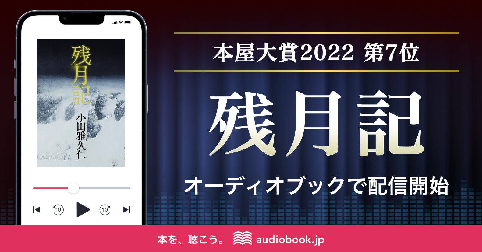 日本一のオーディオブック書籍ラインナップ数(※)を配信する「audiobook.jp」を運営する株式会社オトバンク( 本社:東京都文京区、代表取締役社長:久保田裕也、以下「オトバンク」)は、今年4月6日に発表された「2022年本屋大賞」にて7位となった『残月記』(小田雅久仁著、双葉社刊)を音声化し、2022年9月27日よりオーディオブックで配信開始いたします。また、発売当日より、月額950円(税込)の聴き放題プランでも配信いたします。