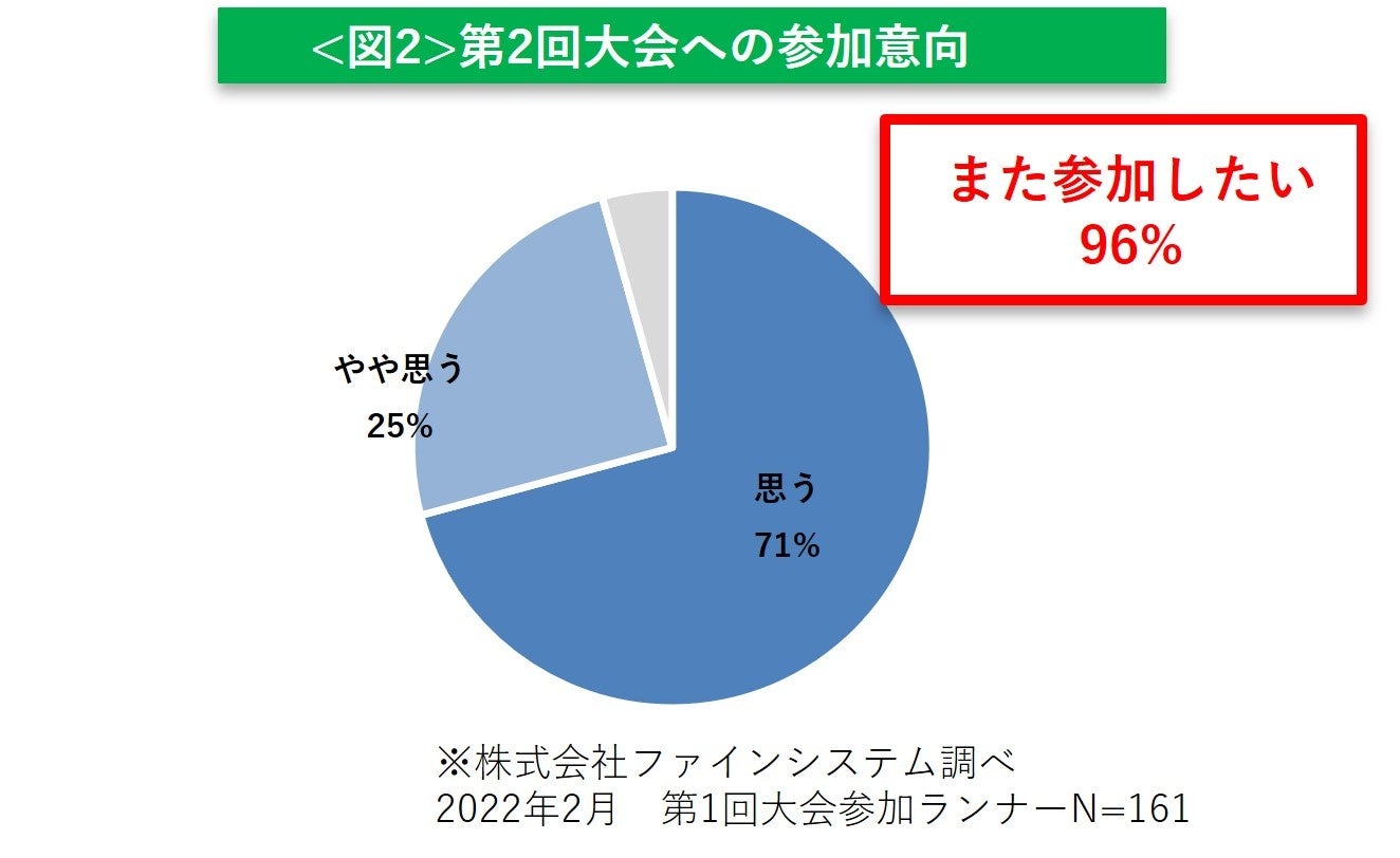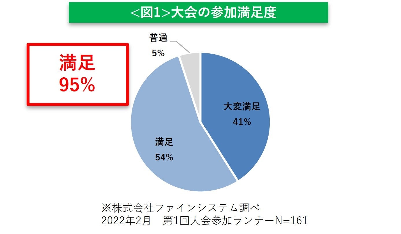 2022年1月~2月に開催された第1回大会では、全国から414名のランナーが参加し、全国を駆け抜けました。大会後のアンケートでは95%のランナーが大会に「満足している」と回答しました<図1>。また次回大会への参加意向も96%と高く、多くのランナーに楽しんでいただけたことが分かります<図2>。