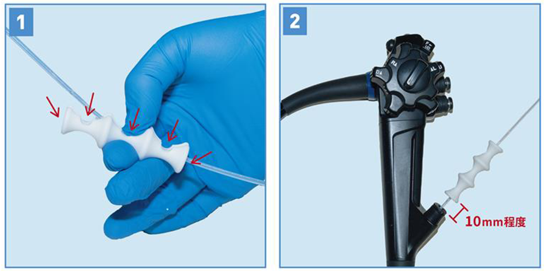 ② 本品を持ち、右図のように鉗子口から10㎜程度離れた位置で処置具を操作する。