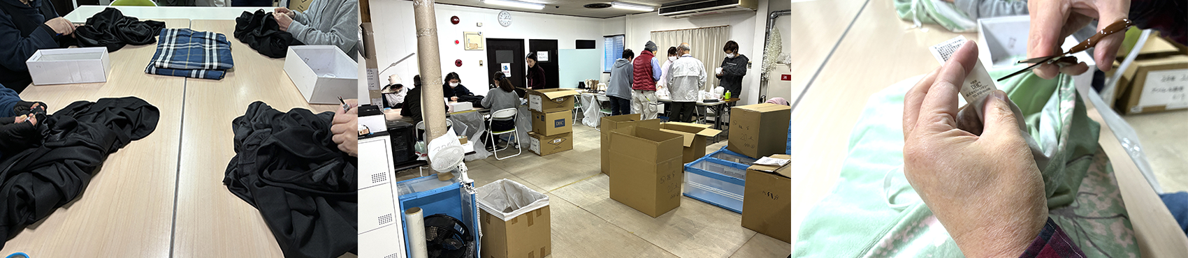 shoichiでは、「助け合いの輪で廃棄在庫に海外での新しい販路と未来を」という理念のもと、余剰在庫や未使用品を単なる廃棄対象ではなく、必要とされる場所へつなぐ社会的資源として捉え、国内外での支援活動を推進しています。今回の取り組みにおいても、tasukeai haiki 0のメンバーが、必要とされる方々のもとへ確実に届けるため、DHC様の未使用衣料品を一つひとつ丁寧に仕分けし、検品・梱包作業を行いました。