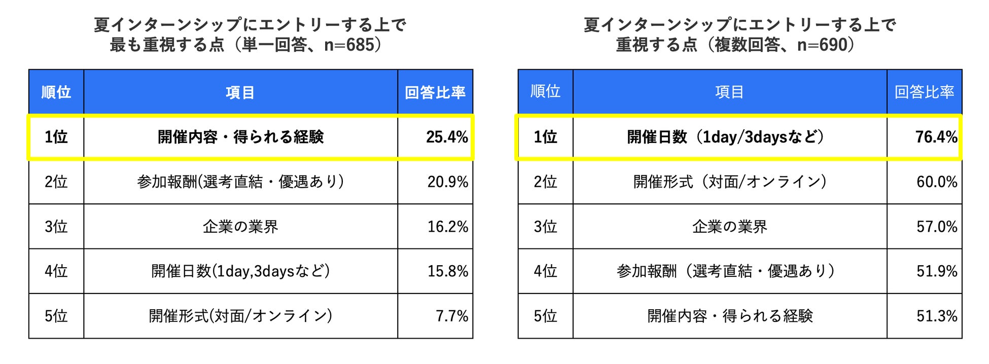 夏インターンシップにエントリーする際に最も重視する点について尋ねたところ、25.4%が「開催内容・得られる経験」と回答しました。その一方、複数回答では76.4%が「開催日数(1day/3daysなど)」、次いで「開催方式(対面/オンライン)」(60.0%)の順となり、複数社の夏インターンシップに参加したい学生にとって、限られた時間をどのように配分するかを検討した上で「開催内容と得られる経験」を重視していることがうかがえます。
