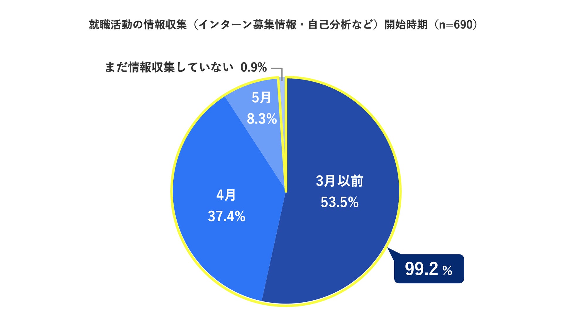 今回の調査では、回答をした2027年卒学生のうち、ほぼ全回答者となる99.2%が、夏インターンシップの情報収集を5月までに開始していることが判明しました。大学2年生の3月以前は53.5%だったことから、4月の進級をきっかけに情報収集が一気に活発化した様子がうかがえます。
