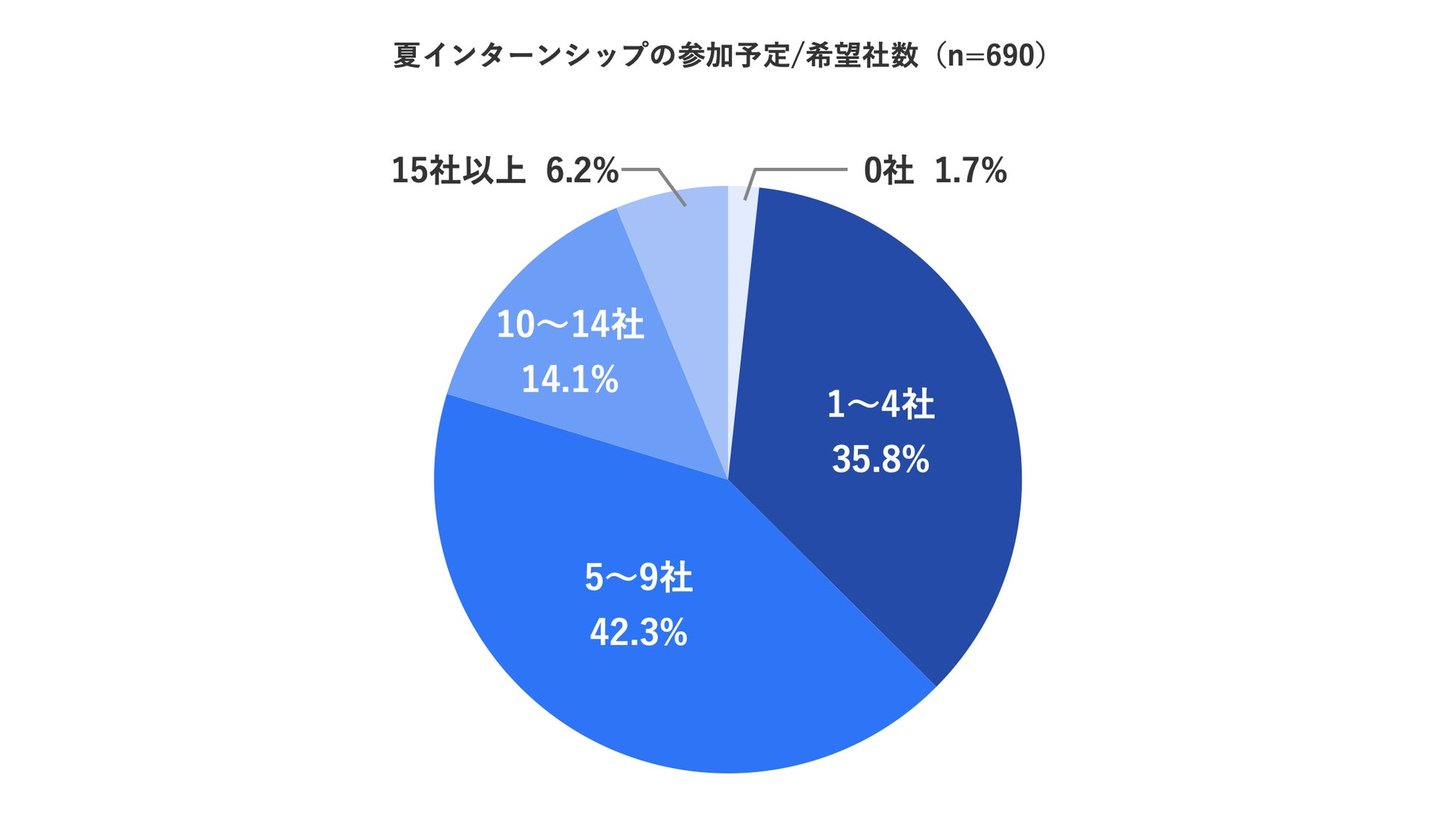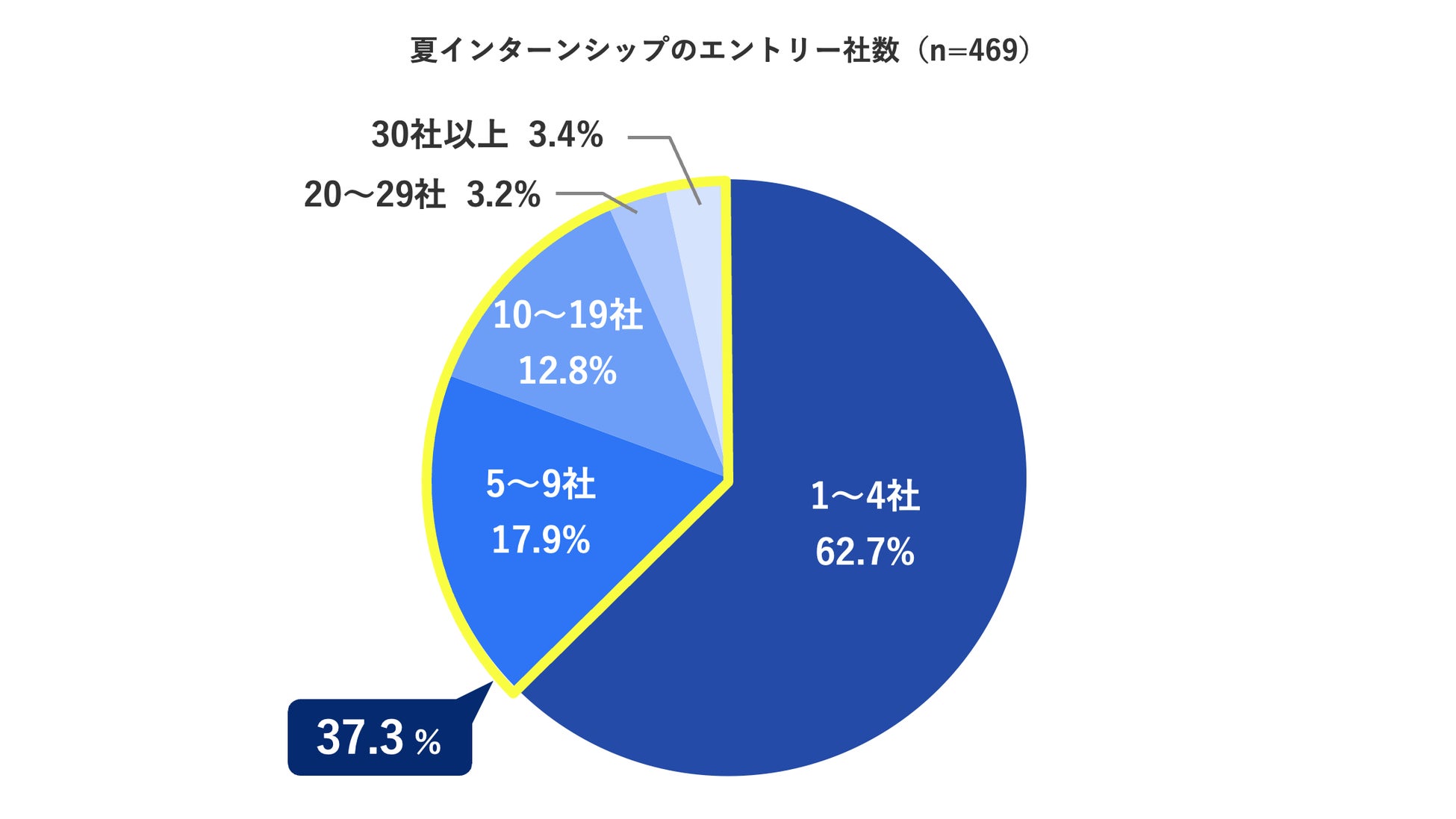 エントリー時期を見てみると、5月時点で全体の65.6%が夏インターンシップにエントリーしています。エントリー数は「1〜4社」が62.7%で最も高く、最頻値は「1社」となりました。なお、37.3%は「5社以上」にエントリーしています。また、参加希望社数は「5〜9社」が42.3%で、最頻値が「5社」であることから、6月以降にエントリーが本格化していると想定されます。