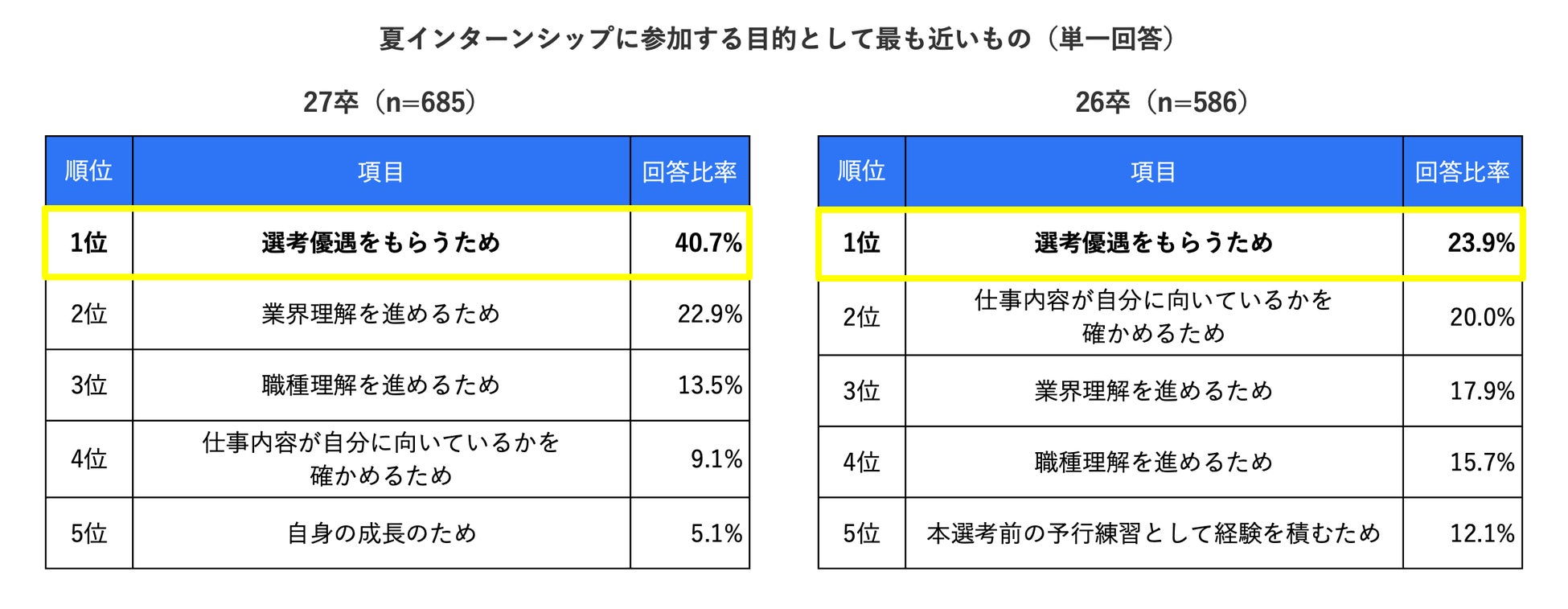夏インターンシップの参加目的は「選考優遇をもらうため」が最多
