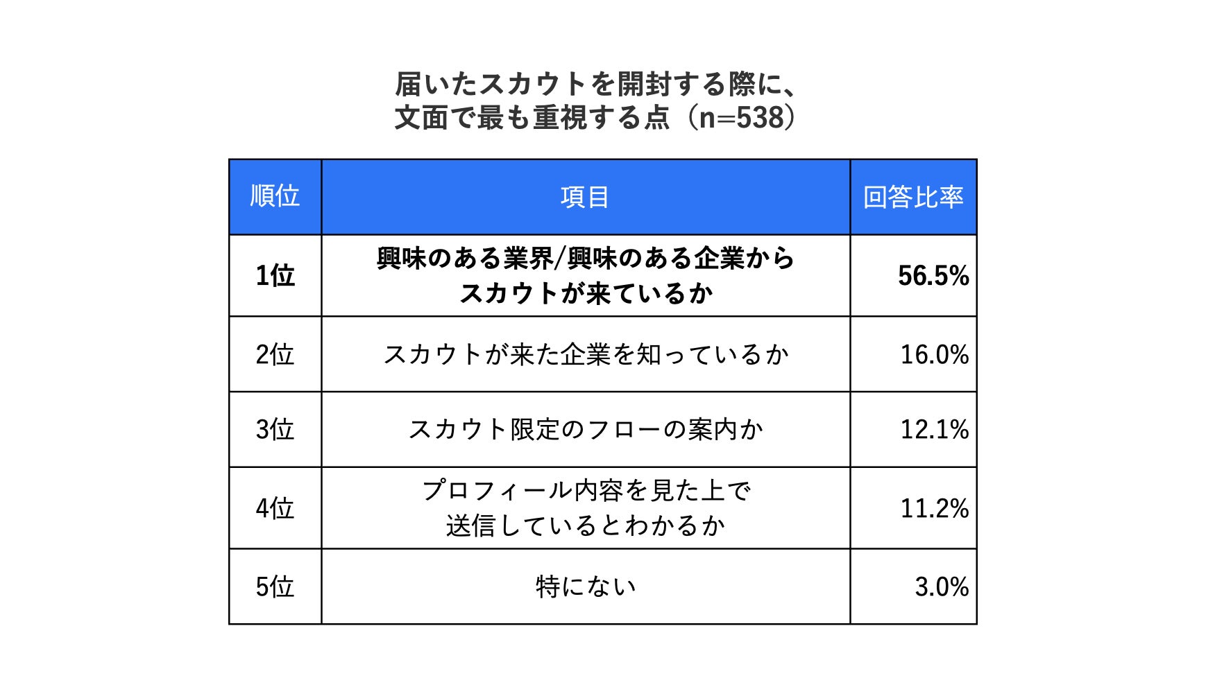 最後に、近年拡大してきているスカウト型の採用について調査したところ、約8割の学生がスカウトサービスに登録していることがわかりました(78.0%)。また、スカウトメールを開封する際に重視する点では、「興味のある業界/企業からスカウトが来ているか」が他の理由に3倍以上の差をつけました(56.5%)。