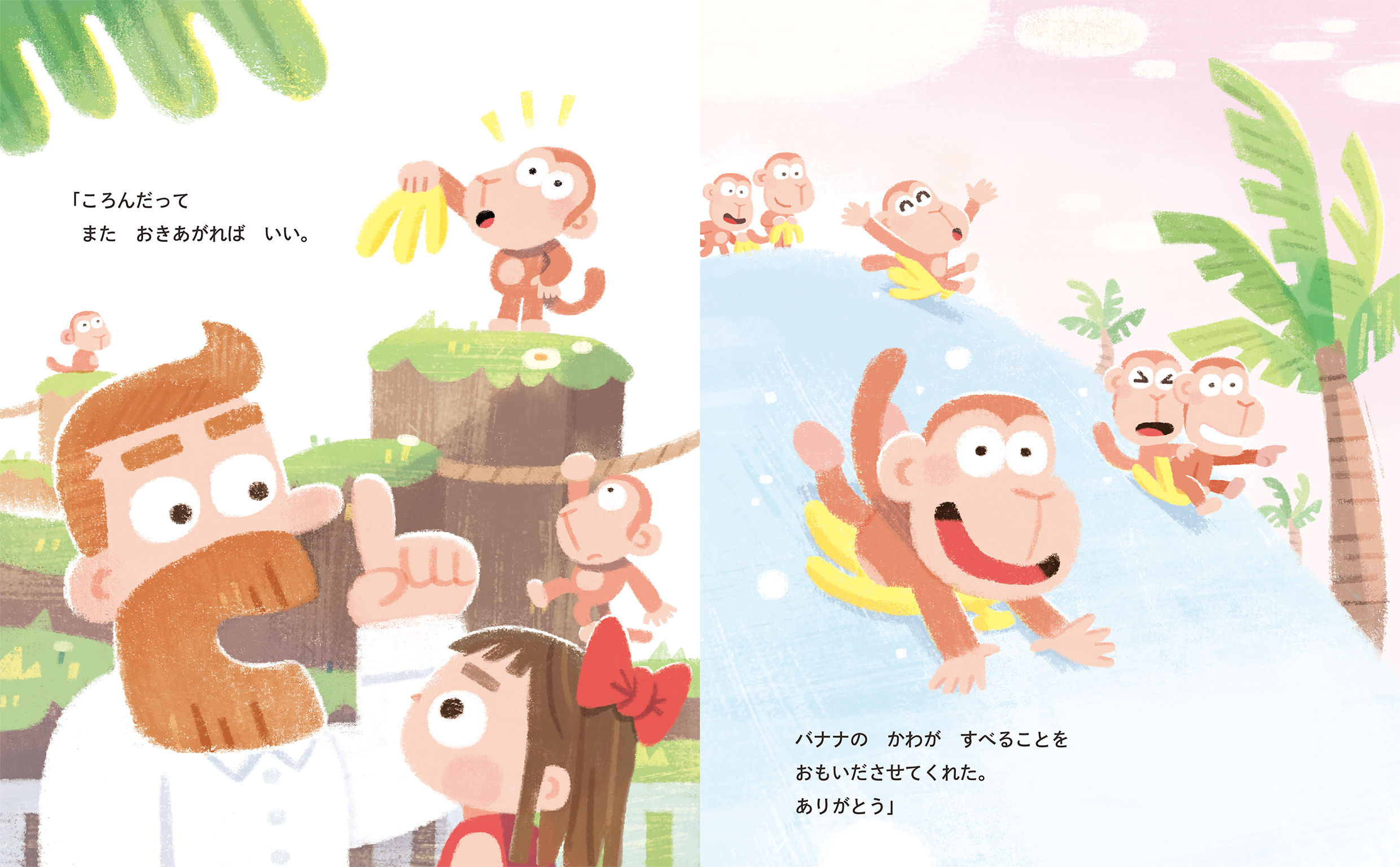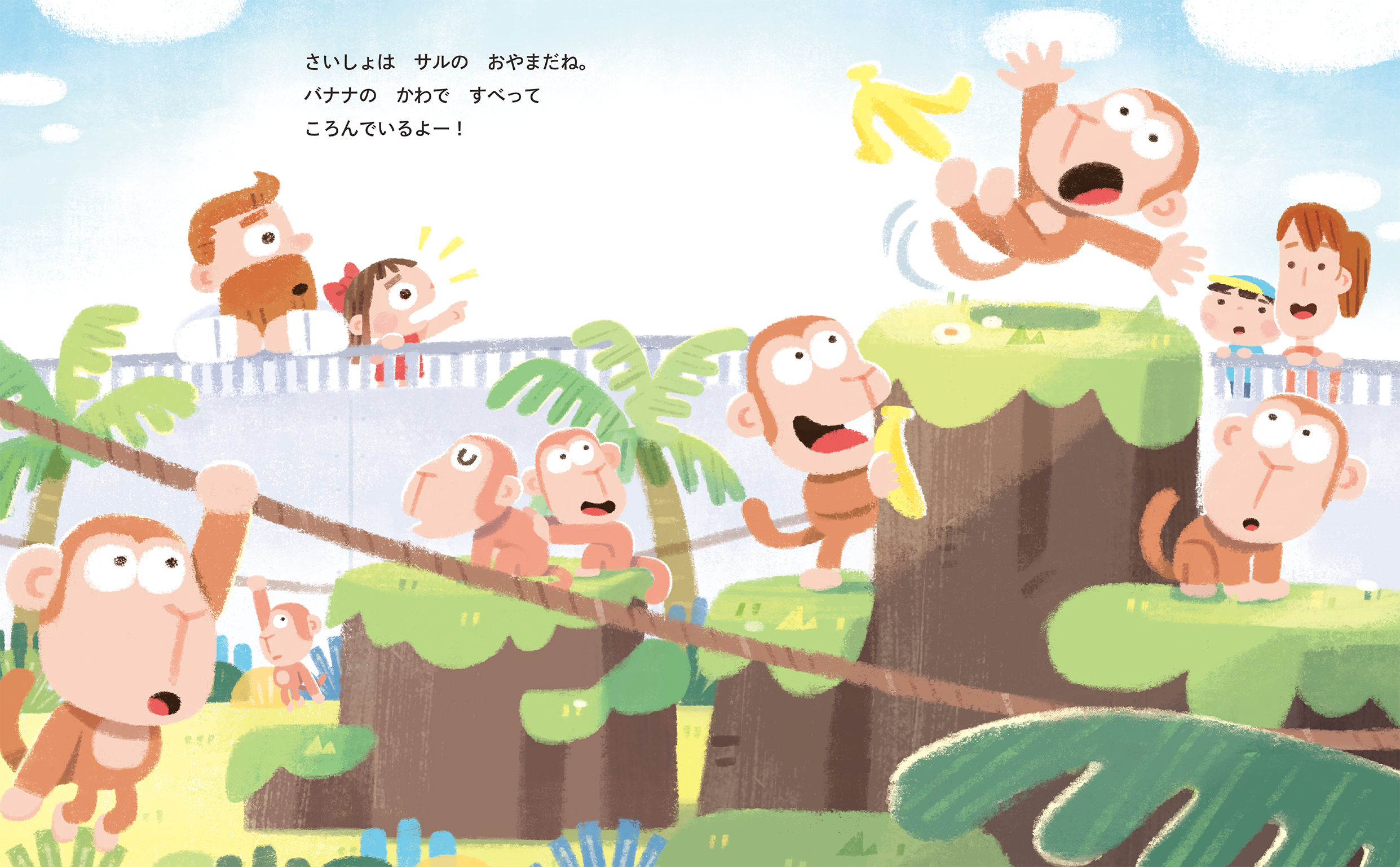 サルたちは、 バナナの皮を使って坂道を楽しくすべります。