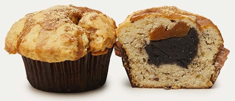黒ごまきな粉を混ぜ込んだ生地に、黒ごま餡とあんずを入れて焼き上げました。仕上げに黒蜜アイシングをかけて仕上げました。きな粉と黒ごまのコクのある甘みと、あんずの酸味の相性がよいマフィンになっています。