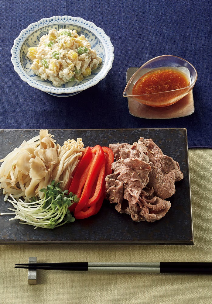 主菜の牛肉は火を止めて優しく泳がせるようにしゃぶしゃぶして、しっとり仕上げることが大切。さつまいもにチーズをきかせた副菜の白あえと共にワインにあう献立です。