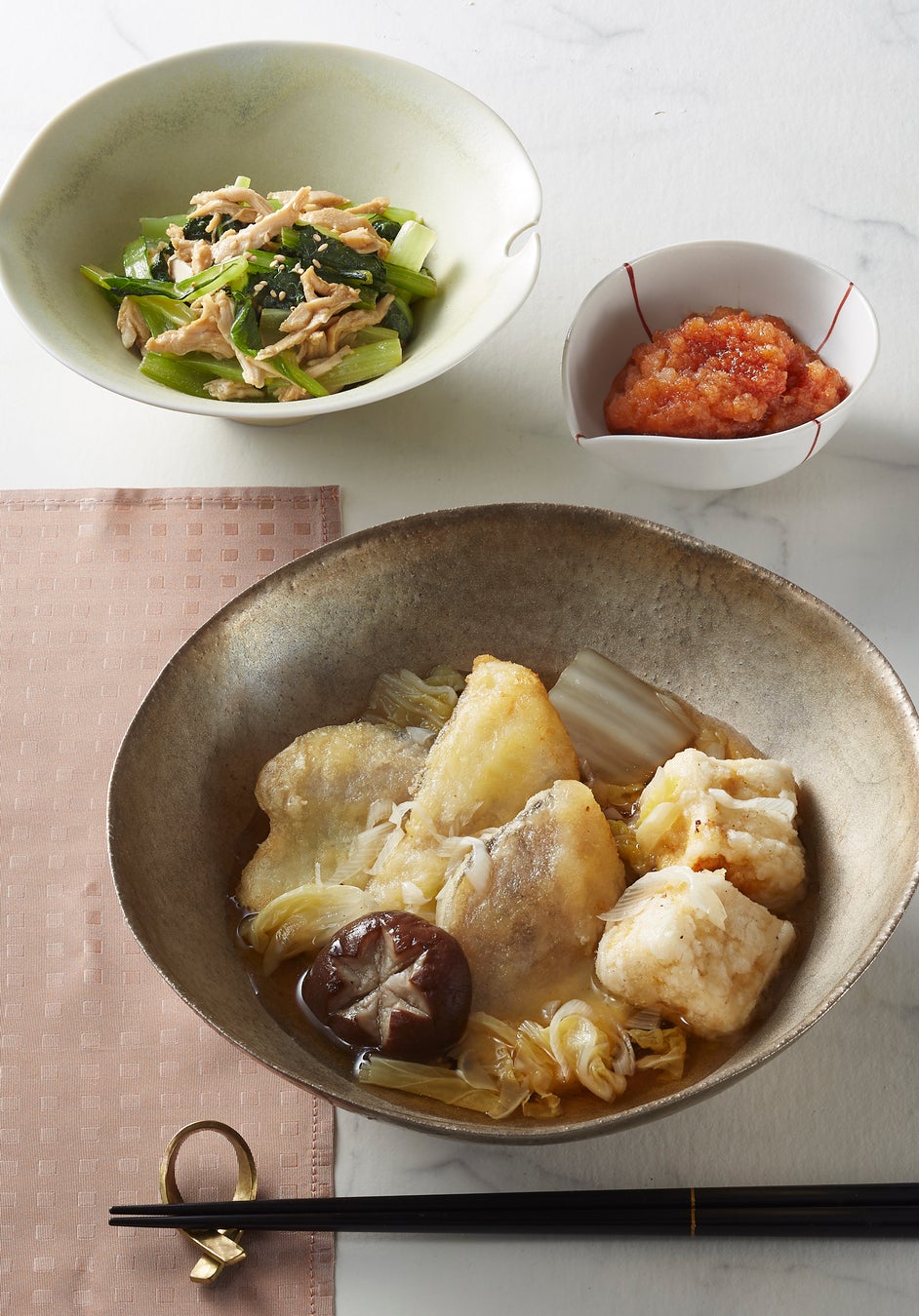 たらとお豆腐の揚げ出しをお野菜と共に召し上がっていただく、バランスの良いメニューです。副菜はヘルシーでお酒のつまみにもなる、大人の味のあえものです。
