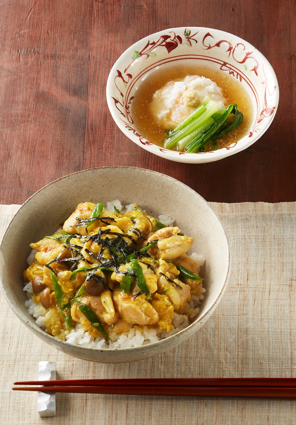 わけぎとほのかに香るカレーでいつもとひと味違う親子丼に。蕪蒸しで使うかぶの葉は、実の部分よりたくさんの栄養があるので、余さず使いましょう。