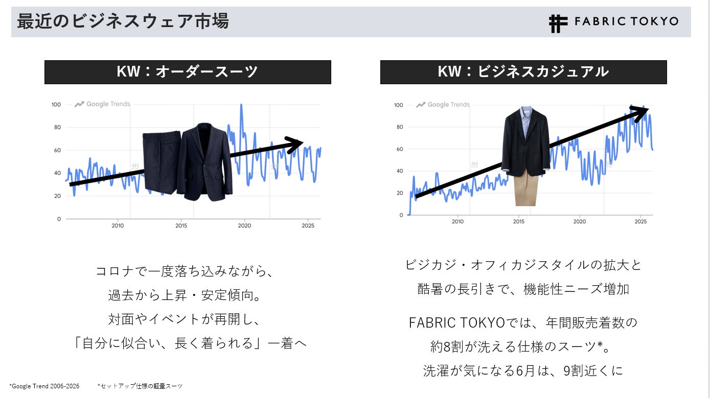 コロナ以降、対面やリアルイベントが増え、自分に似合い長く着られるスーツの需要が高まり、オーダースーツ市場は伸びています。加えて、ビジネスカジュアルスタイルも猛暑の影響もあり、機能性重視のウォッシャブルニーズが高まっており、FABRIC TOKYOでは、オーダーされるビジネスカジュアルスーツの約8割がウォッシャブル仕様となっています。(土山氏)