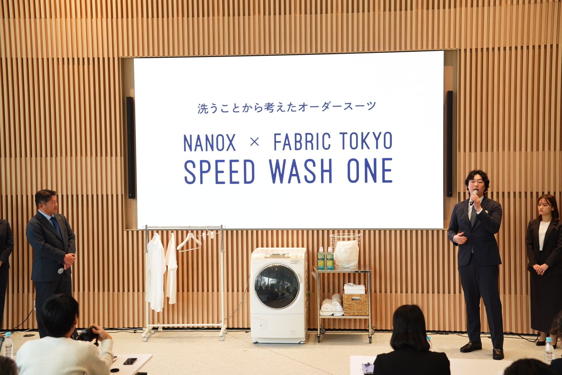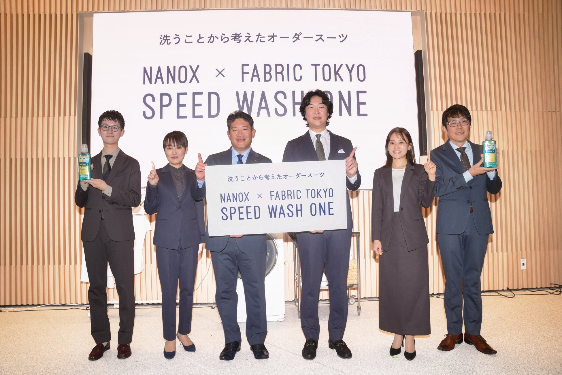 発表会冒頭では、新発売のオーダーセットアップをライオンとFABRIC TOKYOの社員によるファッションショー形式で初披露。その後、ライオンの竹森社長とFABRIC TOKYOの森社長も共同開発のスーツを着用して登壇し、スーツ名『NANOX × FABRIC TOKYO SPEED WASH ONE』を発表しました。
