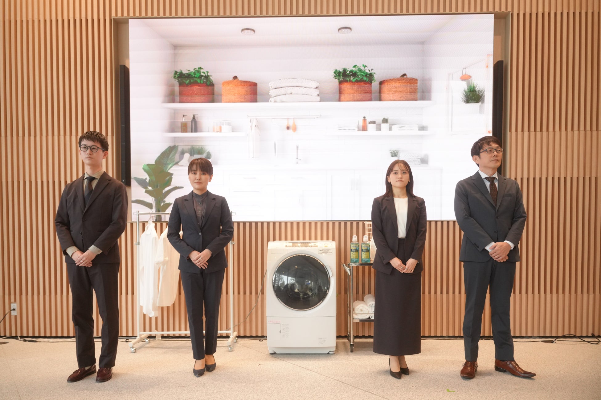 ライオンお洗濯マイスター・片木が、本プロジェクトのために開発された「オリジナル洗濯ネット」を使ったスーツの洗濯方法を実演しました。スーツを洗う時、消費者の多くの方が抱く「どう畳めばいいのか分からない」という不安を解消するため、本洗濯ネットは、畳み方が簡単にわかる構造になっている点、かつ洗い方ガイドが施され、初めてでも迷わず使える設計になっている点を説明しました。さらに、他の洗濯物と一緒に洗える点にも触れ、スーツ洗濯が日常のお洗濯で手軽に実践できることを紹介しました。