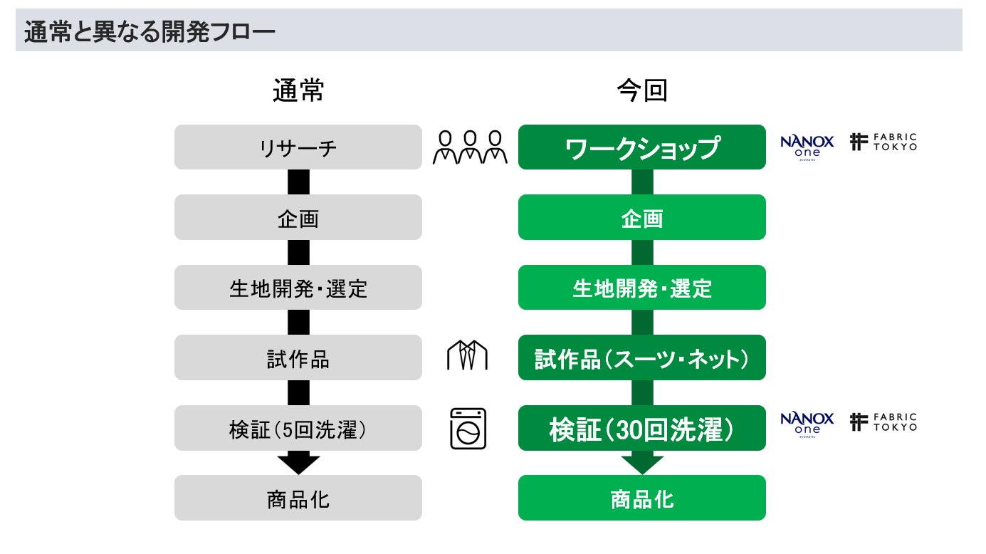 そこで「洗うことから考えたウォッシャブルスーツ」の共同開発をスタートさせました。まずは両社が共同開発する製品のコンセプトを策定するワークショップを開催、その後、企画、生地の開発と選定、スーツとオリジナル洗濯ネットの試作品を繰り返し、『NANOX one PRO』で30回の洗濯検証を経て商品化となりました。(土山氏)