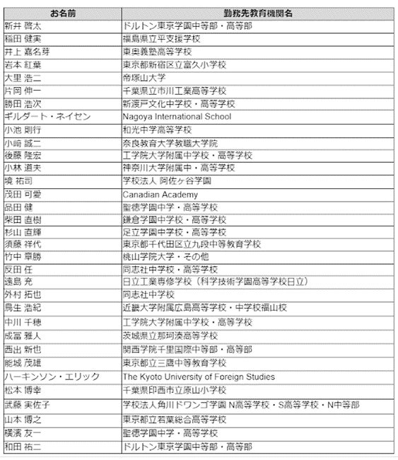 小学校2名、中学校1名、中高一貫校16名、高等学校6名、大学4名、専門学校1名、特別支援学校1名、インターナショナルスクール2名
