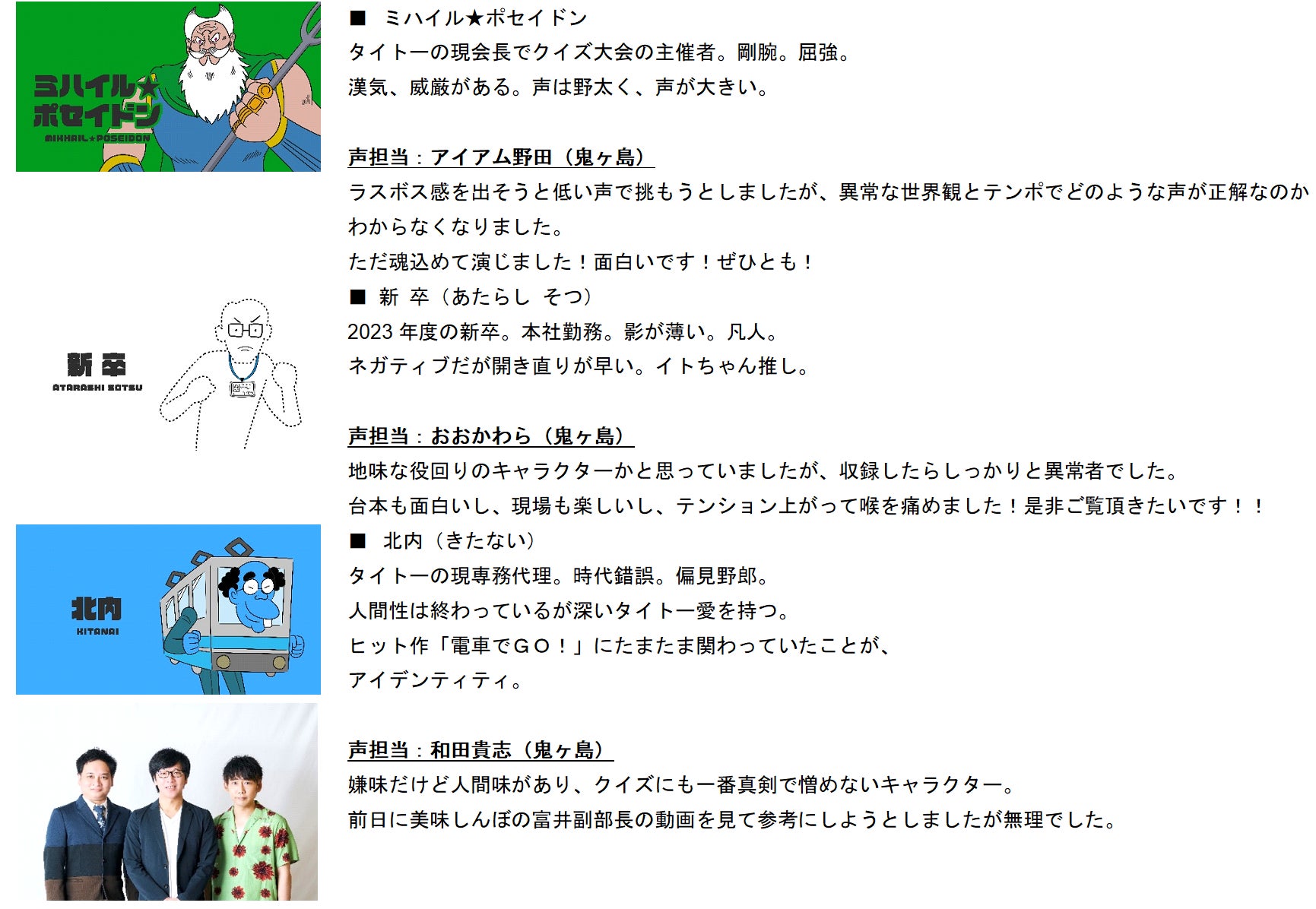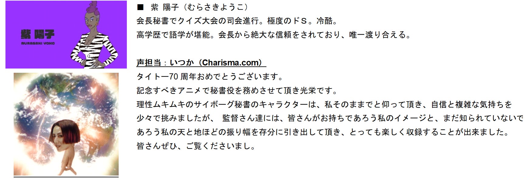 今回、豪華キャストを迎えて製作されたオリジナルアニメ「めざせ社長!イトちゃんのやぼう」は、タイトーの歴史や取り組み等を、画面の向こう側にいる若い世代を含めた多くの方々に何度でも見ていただけるよう、3 分~5 分のショートアニメーション動画で、「第一回ワクワク社長争奪クイズ大会」決勝戦の模様を全7話にわたってお送りします。