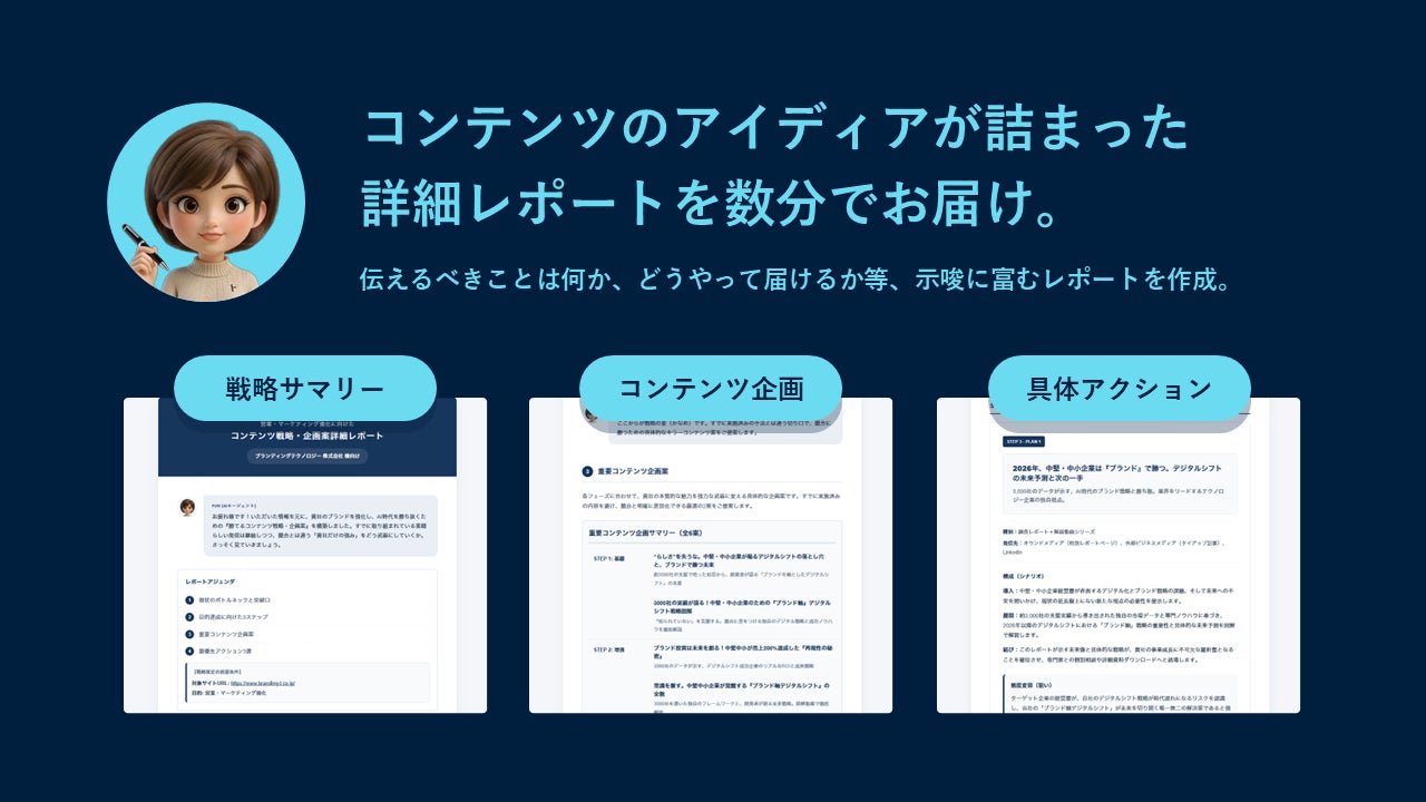 営業販売や採用強化、BtoB、BtoCなどユーザーの状態に合わせた企画が可能です。「コンテンツ戦略サマリー」「目的達成に向けた3ステップ整理」「重要コンテンツ企画案《6本》」「最優先アクション3選」を網羅した実践的な詳細レポートを数分で作成し送付します。レポートを叩き台としたプロ人材とのコンテンツ企画会議も可能です!