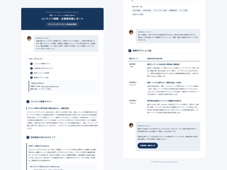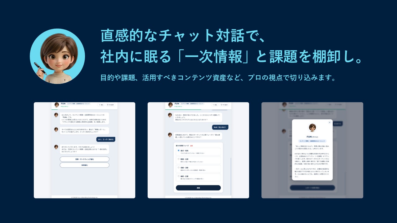 ブランディングテクノロジー株式会社(代表取締役社長:木村 裕紀、本社:東京都渋谷区、証券コード7067、以下当社)は、グループ会社であり、コンテンツプロデュースカンパニーとして企業のコンテンツマーケティング・ブランディング活動を支援する株式会社ファングリー(本社:東京都渋谷区、代表取締役:松岡 雄司、以下ファングリー)との共同開発により、AI時代を勝ち抜くコンテンツ戦略・企画を策定するAIエージェント『FUNさん』の無料提供を開始いたしました。