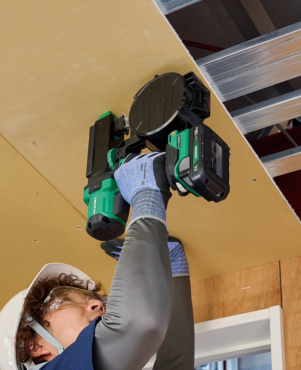 連結ねじドライバは、ロール連結ねじ(シート連結)の締め付けができる石こうボード張りに特化した電動工具です。HiKOKIのコードレス連結ねじドライバ WF1804DAは、質量2.1kgの軽量設計に加え、重心が手に近く、手首の疲労を軽減できる設計構造で快適な重心バランスを実現しました。またコードレスのため天井向きや作業や押し入れ、屋根裏部などの狭所作業時にコンプレッサやホースの準備が必要なく、作業効率を向上させることができます。さらに、1充電当たり約1,800本※打ち込みができる豊富な作業量も特徴です。