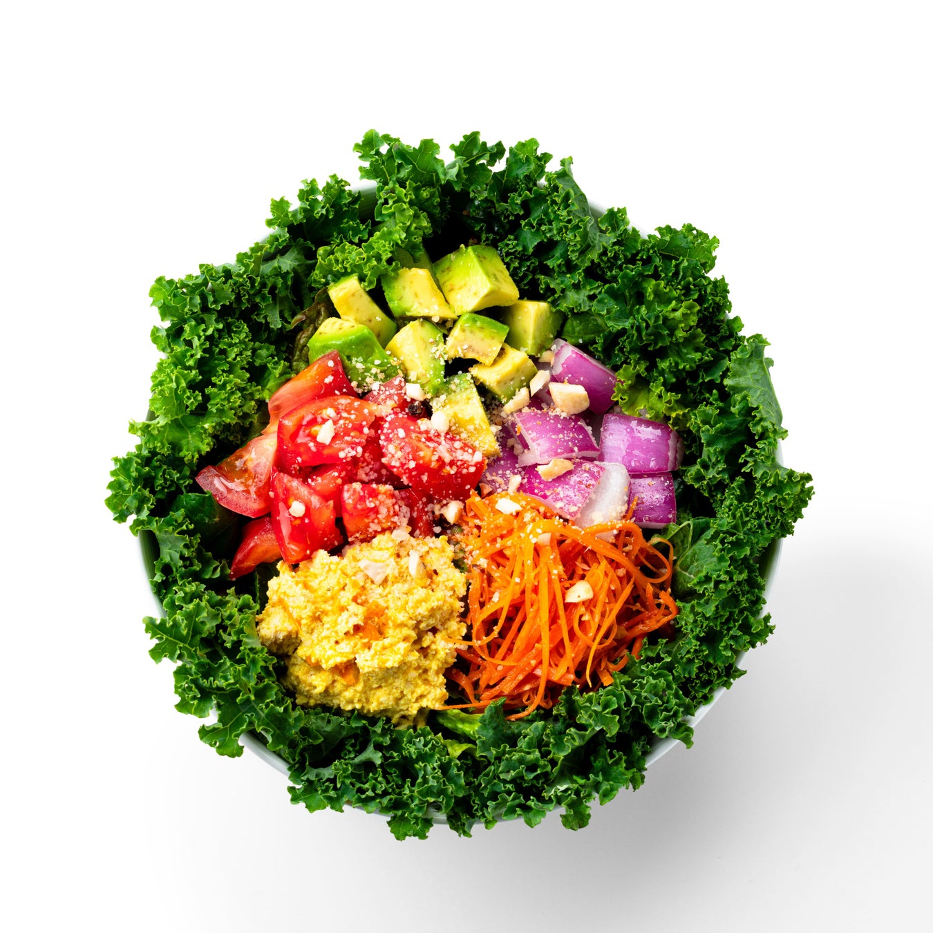 レタス・有機小松菜・ケールがたっぷり入った”1日分の野菜の約半分”※を摂取できるグルテンフリーなサラダ。豆腐でできたプラントベース卵「ノットエッグ」がまろやかなコクをプラス。白味噌の自家製シーザードレッシングが野菜とよく絡み、食べごたえのある仕上がりに。