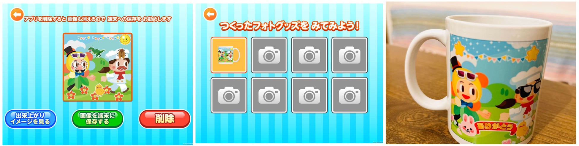 「おみせでグッズをつくろう!」で作ったオリジナルグッズは、自分だけのコレクションとして保存し、いつでも見ることができます。また、作ったグッズ画像をスマートフォンなどの端末に保存する機能があり、パレットプラザの実店舗にて、実際のグッズにすることも可能です。