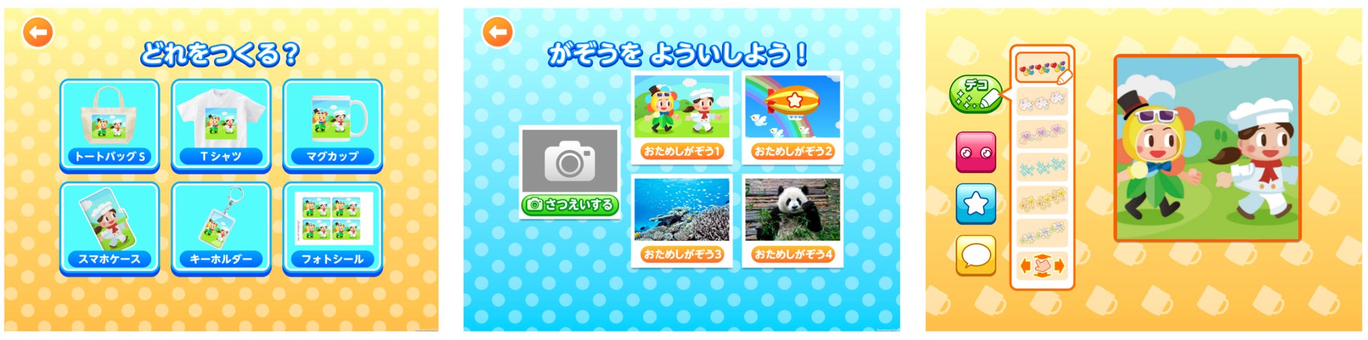 Tシャツやマグカップなど6種類の中から作成したいグッズを選び、印刷したい写真を選択します。写真は、標準設定の「おためしがぞう」4種類のほか、自分で撮影した写真を使うこともできます。グッズと写真を選択したあとは、ペンやスタンプなど100種以上のアイテムを使って自由にデコレーションをし、世界に一つだけのオリジナルグッズ作りを楽しむことができます。