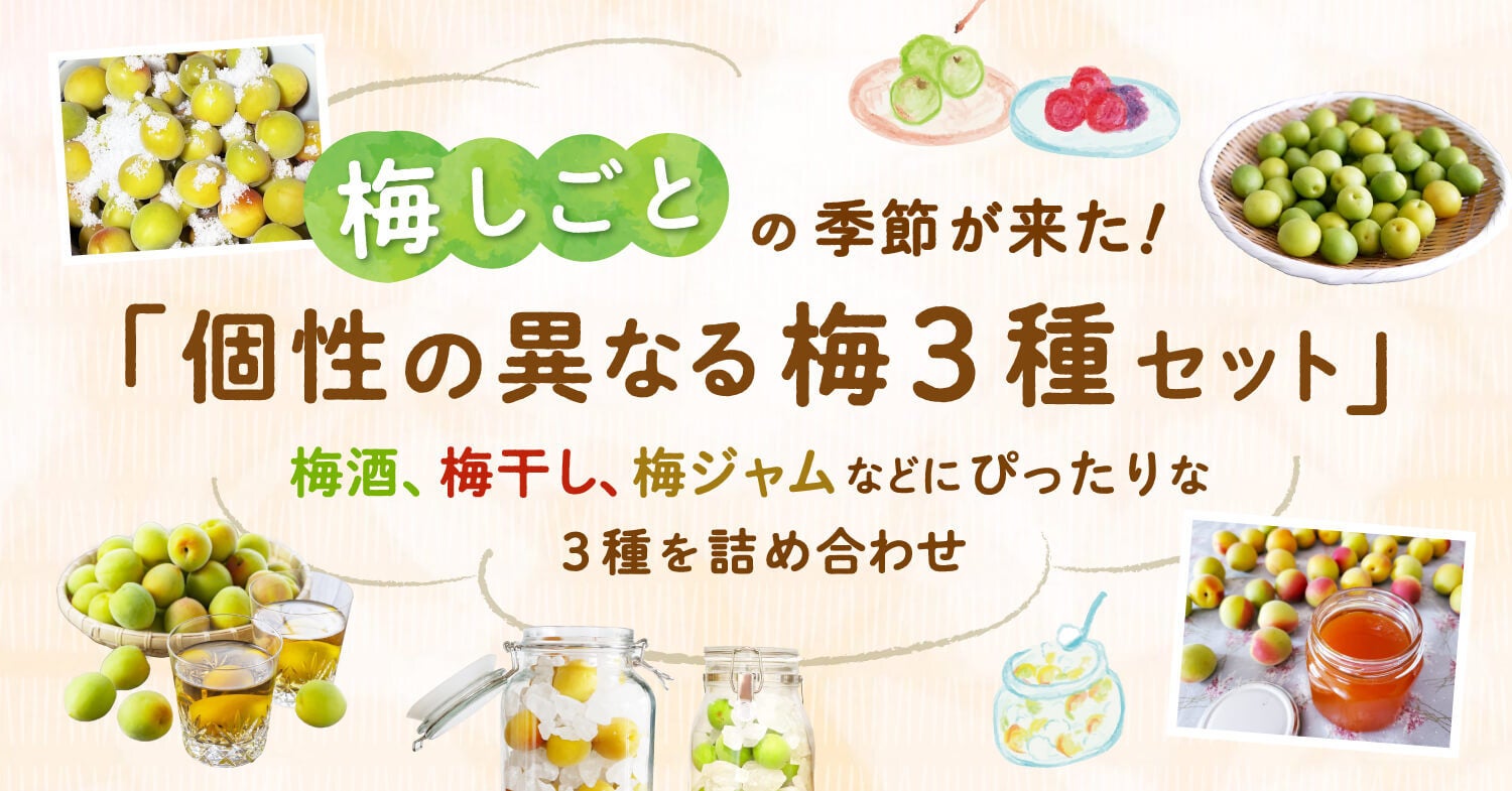 「個性の異なる梅3種セット」は自宅で梅酒、梅干し、梅ジャム等を仕込むのにぴったりな3品種の梅を詰め合わせたアソート商品です。気軽に試せる「お試しセット」、たっぷり作りたい人向けの「大容量セット」の2タイプから選べます。