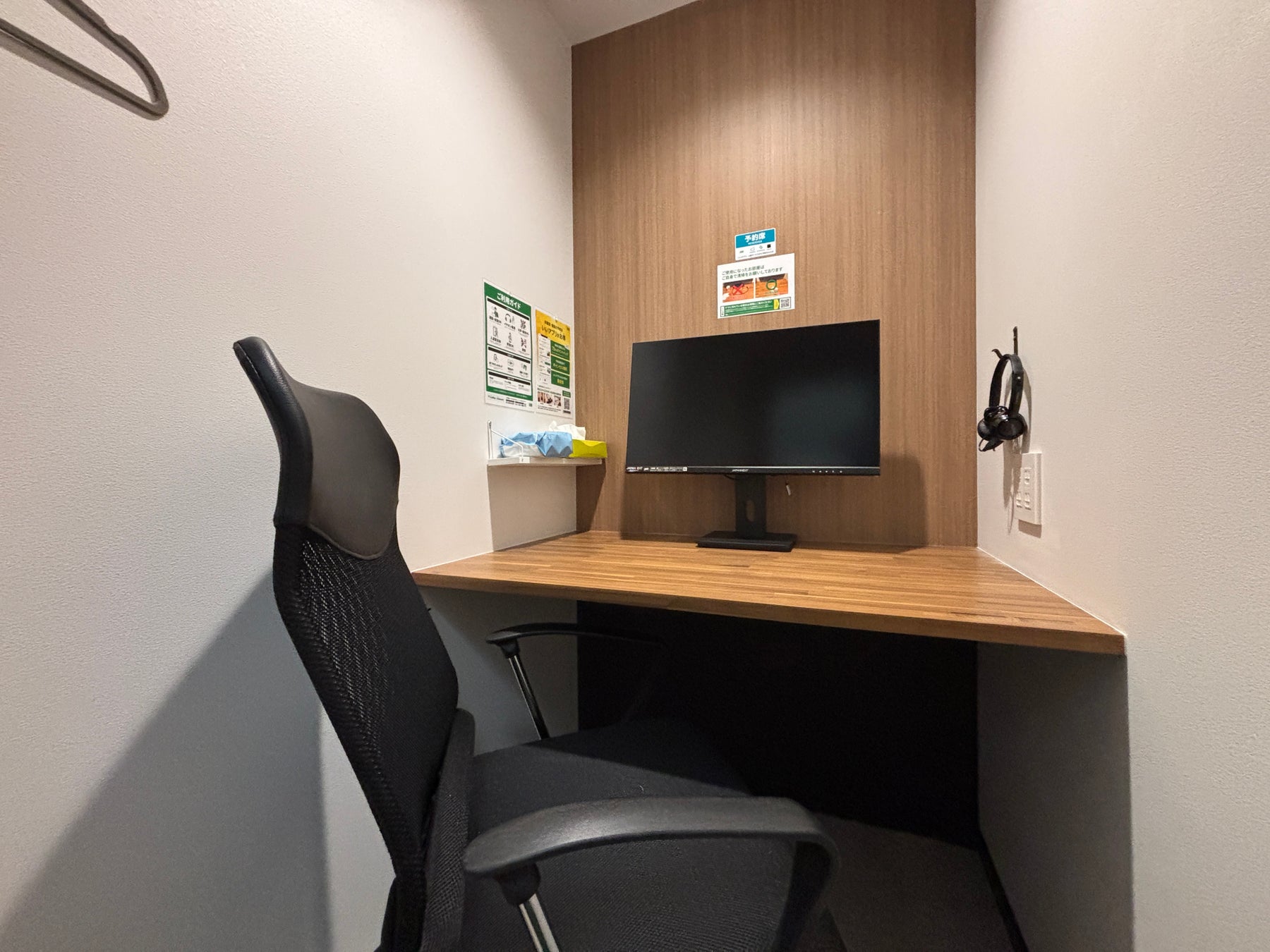 各個室のデスクは幅100cm以上、奥行きも65cm以上で、長時間の利用でも快適にお過ごしいただけます。また、27インチの4Kモニターが完備。効率よく仕事が進む環境をお届けします。